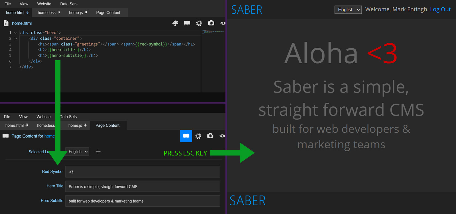 Saber encourages you to write multi-lingual content outside of your HTML files. This is done by using mustache variables {{hello-world}} in place of content when writing HTML code in Saber's Editor. There's a tab in Saber called the Page Content tab which will display a list of form fields generated from the mustache variables that you created in HTML. You can choose which language to use when filling out the form fields, then instantly view a live preview of the content changes within your web page.