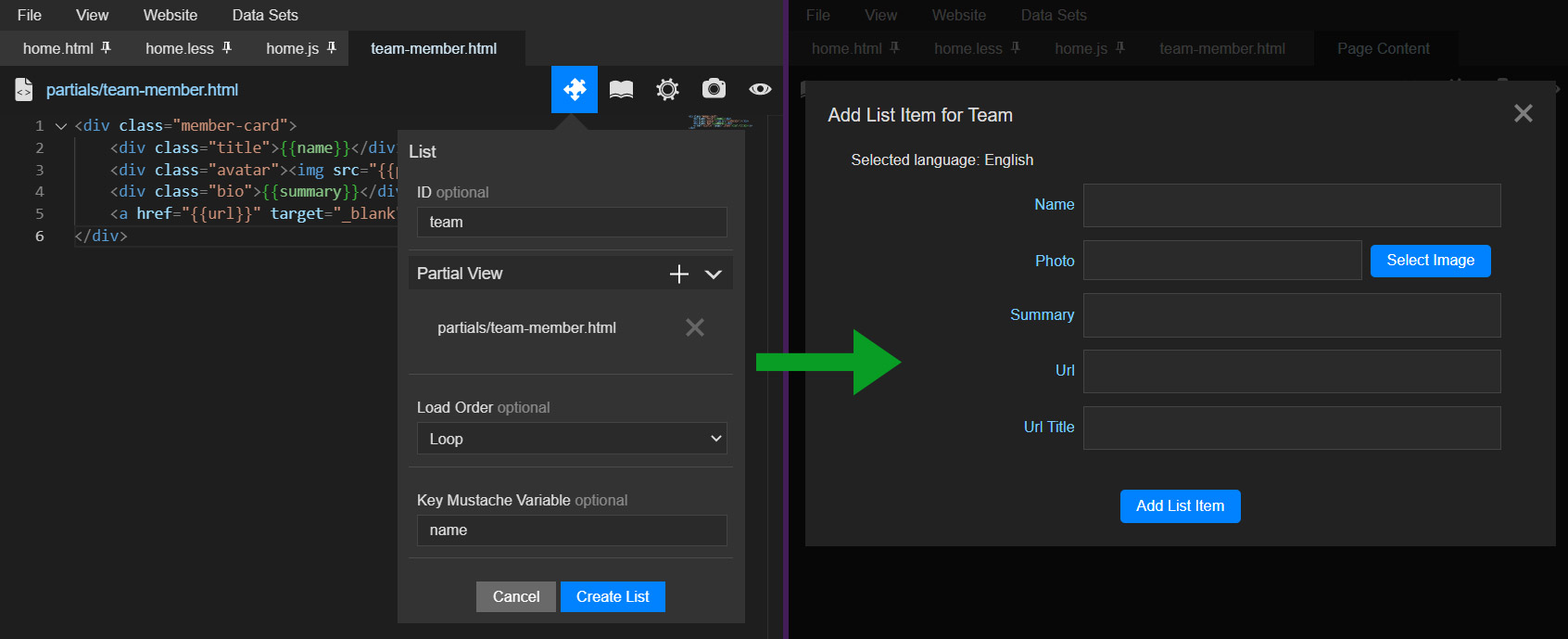 Another powerful feature within Saber is the use of partial views, which are basically just HTML files that can be injected into your web pages to generate dynamic content. For example, you can add a List Component to your web page that will generate a list of content using your partial view for each item in the list and a data set you provide in the Page Content tab.